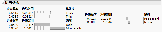 在边缘效应的示例 中,相对于采用蒙特里杰克奶酪的同类比萨饼的测试对象倾向于选择马苏里拉奶酪、厚馅饼皮加意大利辣香肠馅料的比萨饼的概率为 0.9470。