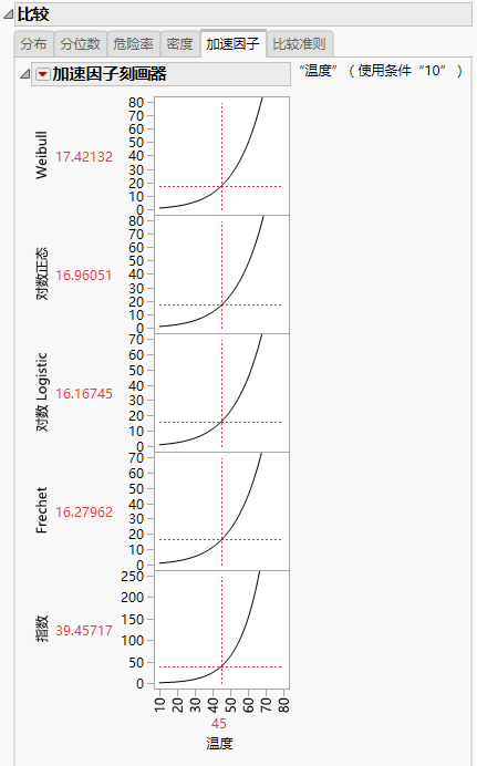 可比较的结果显示在分位数、危险率和密度选项卡上。分布、分位数、危险率、密度和加速因子这些刻画器的行为类似于其他平台中的“预测刻画器”。例如,可拖动温度和小时数的垂线来查看每个分布值如何随着温度和时间变化。有关“预测刻画器”的详细解释,请参见《刻画器指南》中的刻画器。