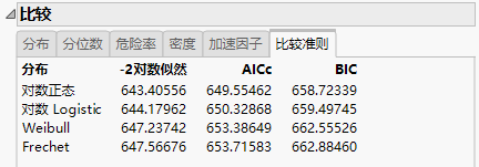 比较准则选项卡显示所关注分布的 -2对数似然、AICc 和 BIC 准则。“比较准则”报表选项卡 显示了 Weibull、对数正态、对数 Logistic 和 Fréchet 分布的这些值。提供更好数据拟合的分布显示在“比较”报表的顶部,这些分布按 AICc 排序。