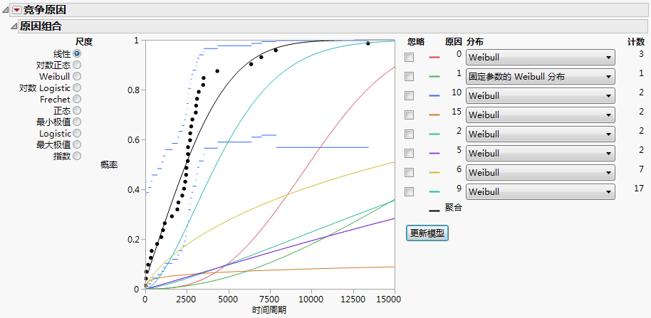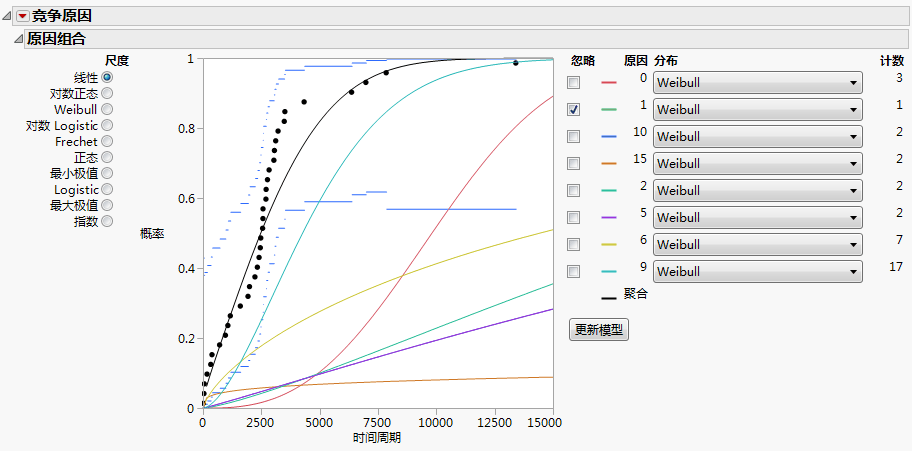 现在聚合模型在总体竞争原因模型中使用“原因 1”的“固定参数的 Weibull 分布”结果。