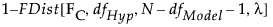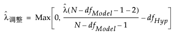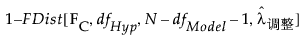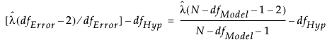 右侧的表达式说明当样本大小 N(与研究大小 n 不同时)被建议用于回顾功效分析时,如何计算无偏非中心参数。其中 dfHyp 表示假设的自由度,dfModel 表示整体模型的自由度。