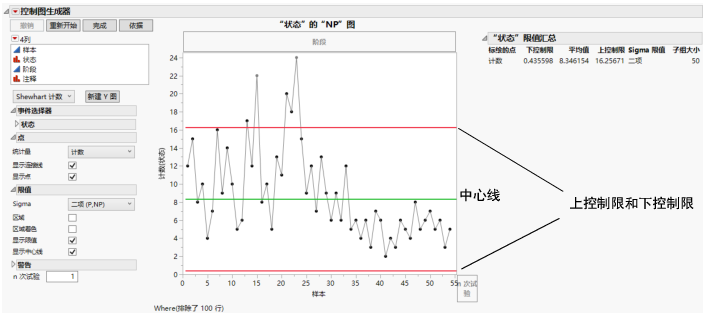 注意:通过在文件 > 首选项 > 平台 > 控制图生成器中撤销选择“显示下控制限”首选项,您可以隐藏散度图、计数图和稀有事件图上的下控制限。