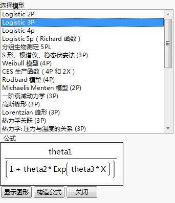 “模型库”可帮助您创建使用参数和初始值的公式列。点击“非线性”启动窗口上的模型库按钮可打开模型库。选择列表中的某个模型即可在公式框中查看其公式。