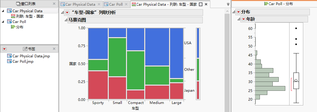 2. 在 Car Poll.jmp 中,运行“分布”脚本。