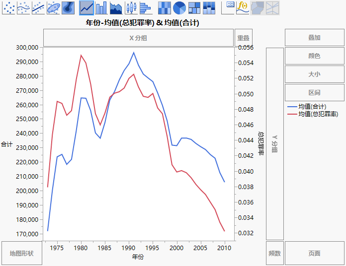 在右侧添加针对总犯罪率的轴,并且各轴重新统一尺度以同时显示两组值。您现在可以看到两个测度之间的关系。例如,两个测度都开始在 1991 年下降。