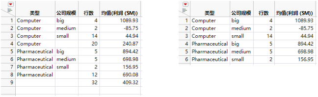 将包含边缘统计量的汇总表(左图)与不含边缘统计量的汇总表(右图)加以比较。您可以看到左图不仅添加了边缘统计量,还有一行显示总共有 32 个 Computer 和 Pharmaceutical 公司。