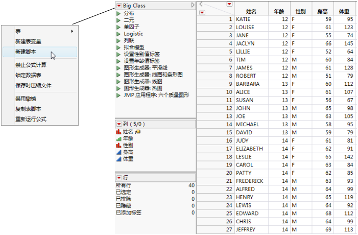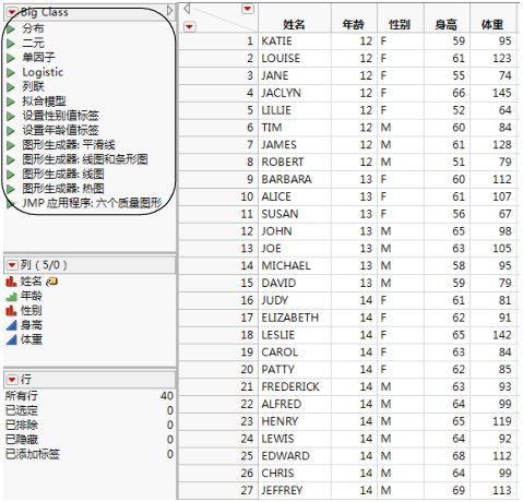 1. 选择帮助 > 样本数据库,然后打开 Big Class.jmp。