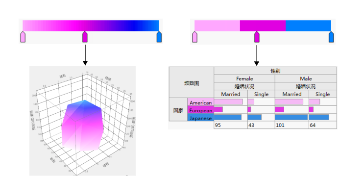 下图显示 JMP 中两种颜色主题(连续和分类)的示例。为连续数据选定颜色主题时,颜色是渐变色(如左图所示)。为分类数据选定同样的颜色主题时,颜色将由差别明显的色块构成。(如右图所示)。