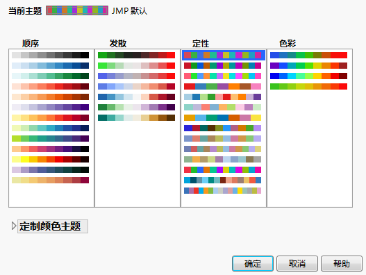 JMP 包括若干颜色主题,用来区分图形中一定范围内的值。您还可以基于现有颜色主题自行创建颜色主题,或创建定制主题。