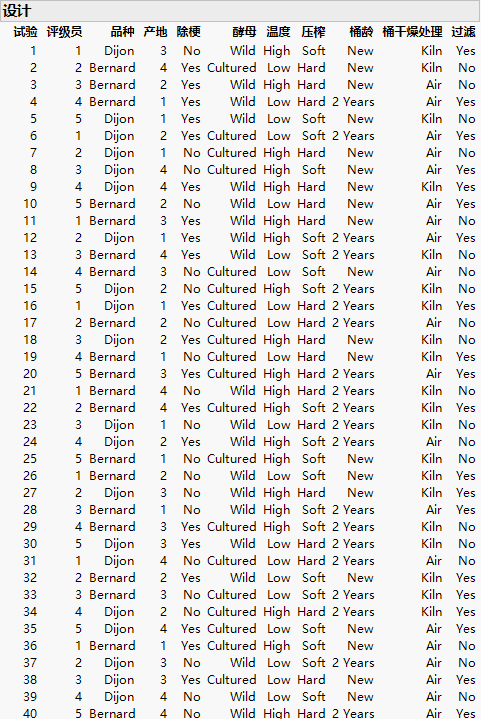 “设计”分级显示项显示您已经构造的设计中的试验。您随后可以在“输出选项”中随机安排试验顺序。当前需要确认该设计是否适合您的实验。例如,确认每一位评级员(共五位)各评估八种葡萄酒,所有必需因子都显示出来,没有任何设置代表不可行的组合。