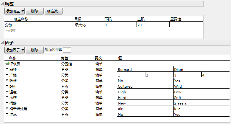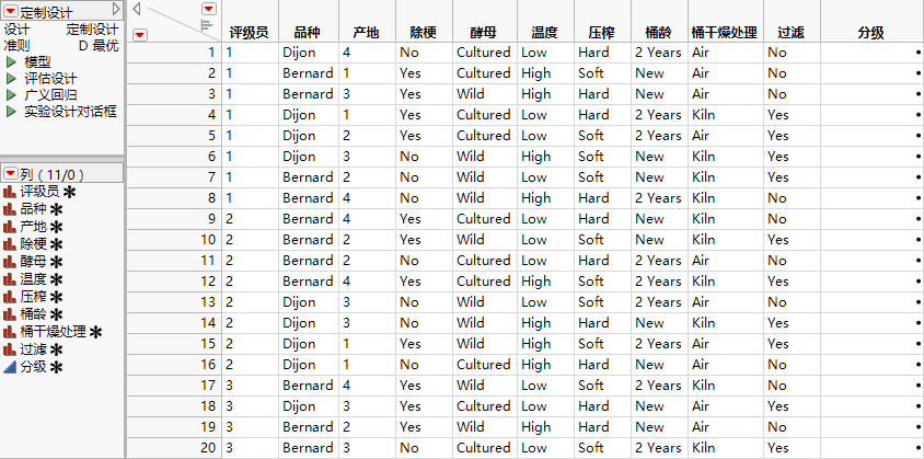 1. 选择帮助 > 样本数据库,然后打开 Design Experiment/Wine Factors.jmp。