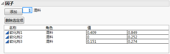 增塑剂设计和 Cornell 得到的结果(Y 值)在样本数据文件 Plasticizer.jmp 中提供。