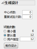 在“生成设计”分级显示项中,您可以输入有关设计的结构和大小的其他详细信息。“默认值”设计显示为包含 12 次试验。回想一下您的设计预算允许进行 12 次试验(试验次数)。