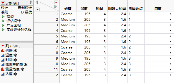 2. 选择帮助 > 样本数据库,然后打开 Design Experiment/Coffee Factors.jmp。