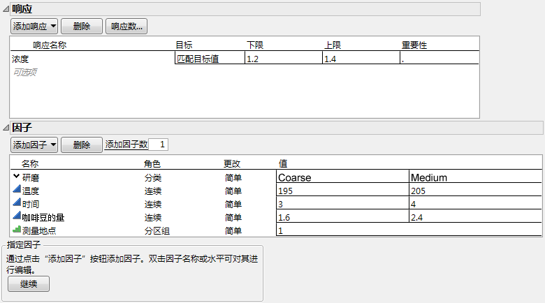 请注意,默认“目标”为最大化。您的目标是找到实现咖啡冲泡目标浓度为 1.3(介于 1.2 到 1.4 的限值之内)的因子设置。