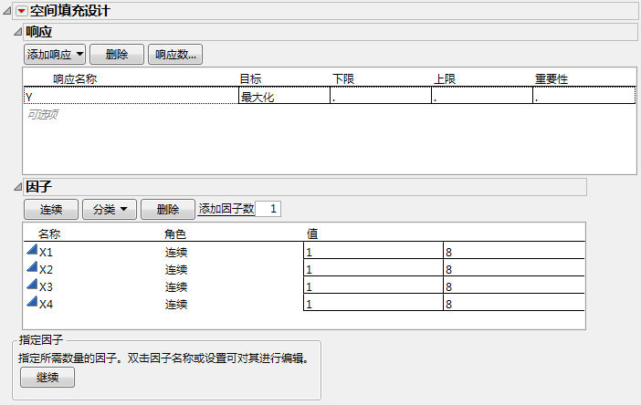 3. 按需更改因子水平值。4 个因子的空间填充对话框 显示将两个因子添加到现有两个因子中并将其值更改为 1 和 8 以替代默认值 –1 和 1。