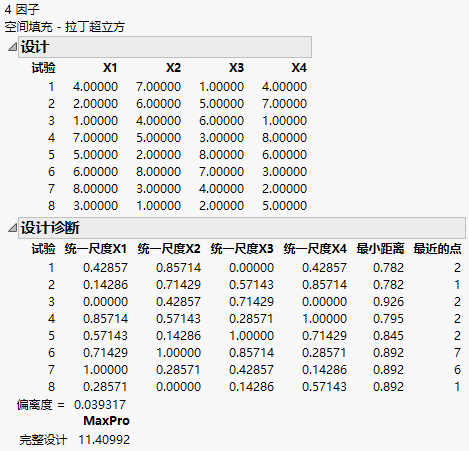 6. 点击拉丁超立方(空间填充设计对话框)。显示的因子设置和设计诊断结果类似于针对具有 8 个水平的 4 个因子和 8 次试验的拉丁超立方设计 中的内容,该图显示具有 4 个因子和 8 次试验的拉丁超立方设计。