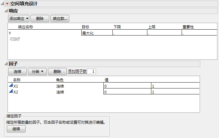 3. 按需更改因子水平值。例如,针对两个因子的空间填充对话框 显示两个现有因子 X1 和 X2 以及它们的值(范围为 0-1,而非默认的 –1 到 1)。
