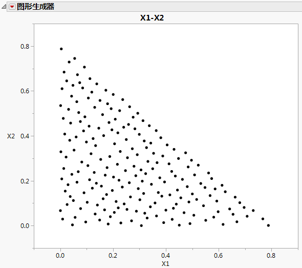 您看到的图形应类似于具有一个线性约束的快速灵活填充设计 中的图。请注意这些点满足线性约束 X1 + X2 £ 0.8。