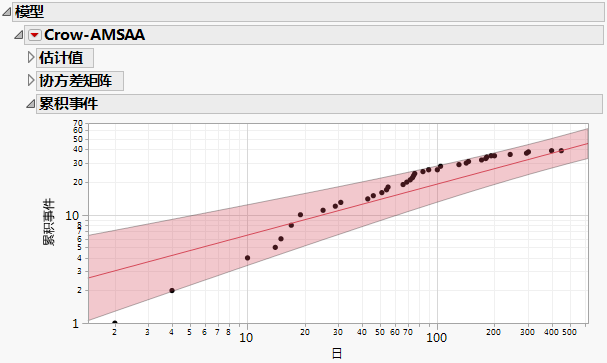 对于 Crow-AMSAA 模型,时间 t 处的累积事件数由 ltβ 给出。由此可见,累积事件数的对数是 log(t) 的线性函数。因此,针对采用对数尺度的轴绘图时,估计的累积事件图是线性的。