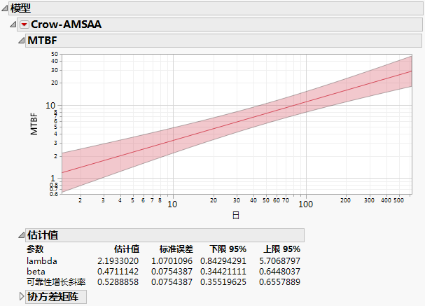 lambda (l)、beta (b) 和可靠性增长斜率 (1 ‑ b) 的最大似然估计值显示在图下方的“估计值”报表中。(MTBF 图)。此外还给出了 l、b 和 1 ‑ b 的标准误差和 95% 置信区间。有关计算的详细信息,请参见Crow-AMSAA 模型的参数估计值。