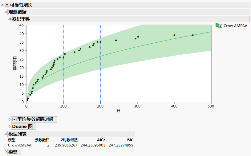Crow AMSAA 的“累积事件”图和“模型列表”报表