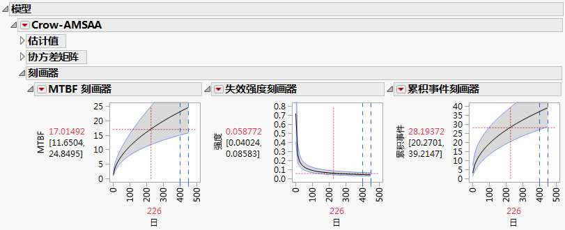 显示三个刻画器,分别显示估计的 MTBF、失效强度和累积事件。这些刻画器不使用对数尺度。通过在任何刻画器中拖动红色垂直虚线,您可以探索各个时间点的模型估计值;选定的时间点值用红色显示在图下面。通过在图中点击时按住 Ctrl 键,您还可以将时间轴设置为特定值。蓝色垂直虚线表示最后观测到失效的时间点。