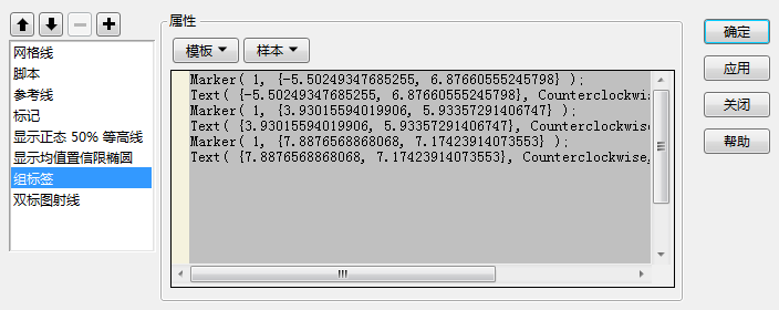 在某些图形中,您可以查看创建图形元素的 JSL。创建“组标签”的 JSL 示例 显示了判别分析图的“组标签”脚本。该脚本定义组标签的标记和文本。无法修改或删除这些内置脚本中包含的命令。您可以从“模板”列表或“样本”列表中插入命令,但无法在窗口中点击和键入新命令。