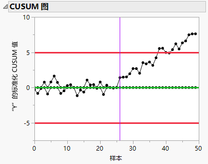 累积和 (CUSUM) 控制图支持您检测过程中的较小偏移。这些图有助于检测随时间出现的偏移(如逐渐漂移),以及不一定伴有突然偏移的偏移。“CUSUM 控制图”平台创建具有决策限的 CUSUM 图,类似于 Shewhart 图。该图亦称表格式 CUSUM 图。要创建 V 形模板累积和控制图,请参见V 形模板 CUSUM 控制图。