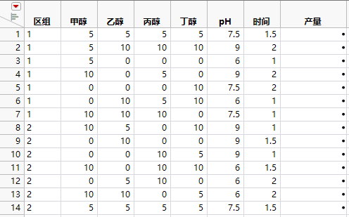 此时,执行实验并将数据记录在设计表的产量列中(针对萃取过程的包含区组的确定性筛选设计)。Extraction2 Data.jmp 样本数据表包含您的实验结果。Extraction2 Data.jmp 样本数据表中试验的顺序不同于针对萃取过程的包含区组的确定性筛选设计 中的顺序。