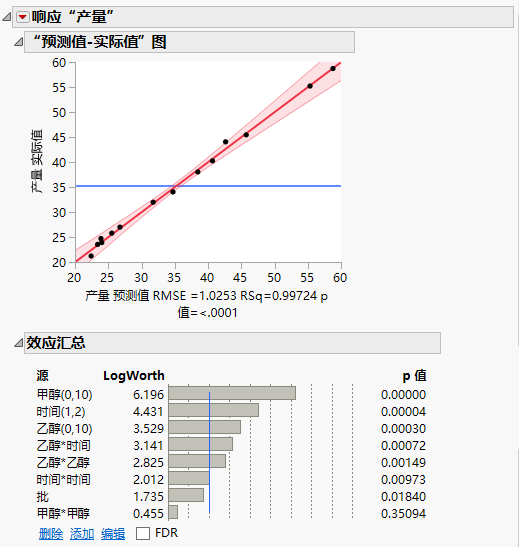 “预测值-实际值图”显示没有证据表明失拟。“效应汇总”报表显示甲醇*甲醇不显著。您决定从模型中删除该效应。