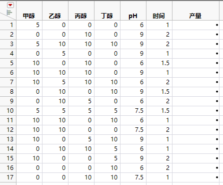 因子及其设置在数据表 Extraction Factors.jmp 中提供。您通过创建确定性筛选设计来展开调查。
