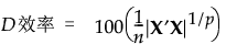 根据 D 最优性准则,设计相对理想正交设计的效率。若设计使回归系数的向量的联合置信区域最小,则设计是 D 最优的: