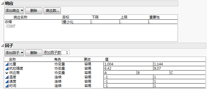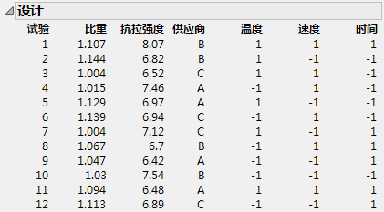 您想要研究三个可控因子温度(模具温度)、速度(转速)和时间(保留时间)对于收缩的效应。但您还想要研究协变量比重、抗拉强度和供应商的效应。您的资源允许执行 12 次试验。