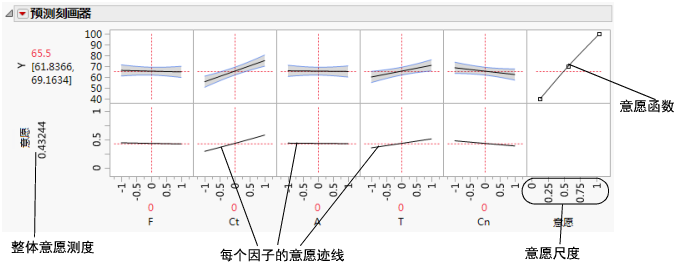 该命令向图矩阵的底部追加一个新行,专用于意愿绘图。该行为每个因子都包含一个用于显示其意愿迹线的图,如意愿预测刻画器 所示。它还会为每个 Y 变量添加一列,其中包含可调整的意愿函数。整体意愿测度显示在意愿迹线行左侧,尺度介于 0 到 1 之间。