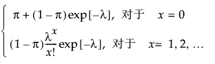 零泛滥 (ZI) Poisson 分布的尺度参数 λ > 0,零泛滥参数为 π。