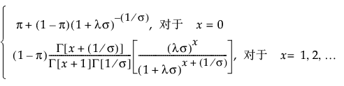零泛滥 (ZI) Poisson 负二项分布的尺度参数 λ > 0,散度参数 σ > 0,零泛滥参数为 π。