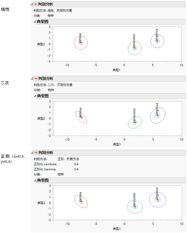 在“线性”、“二次”和“正则”判别分析 中举例说明了“线性”、“二次”和“正则”方法。在此处简要介绍一下这些方法。请参见保存的公式。