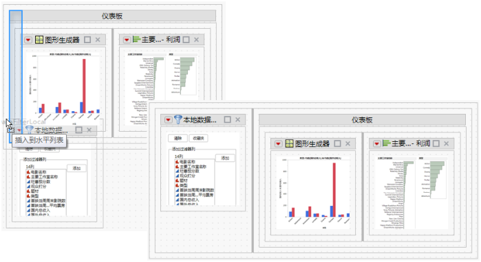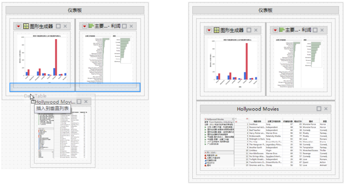 为帮助您在编辑仪表板时重新排列报表,围绕报表的边框包含拖放区。将报表拖至框内不同区域时,框的一部分会突出显示。突出显示的部分显示您可以放置该框的位置。