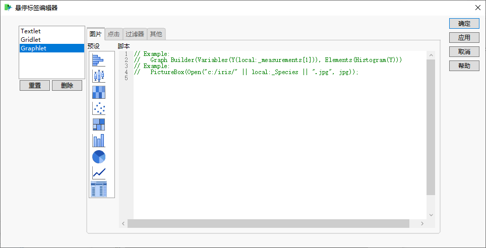 向悬停标签添加图形。点击左侧的预设图或添加 JSL 脚本以定义图形或图像。有关预设图的详细信息,请参见向悬停标签添加图形或图像。