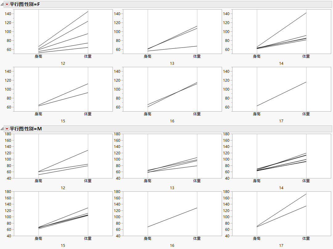 • 在 14 岁女生组中,有一个女生的体重高于她所在年龄组中其他女生的体重。若点击表示该更高体重的线条,相应的个体 (Leslie) 将在数据表中突出显示。