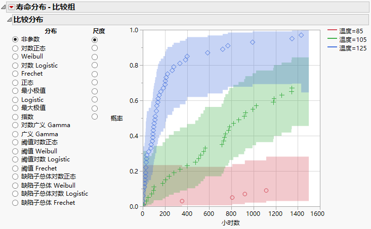 假定您想要在不同组之间比较同一分布。您想要检查某一种电容在三个不同温度下工作时的失效概率估计值。