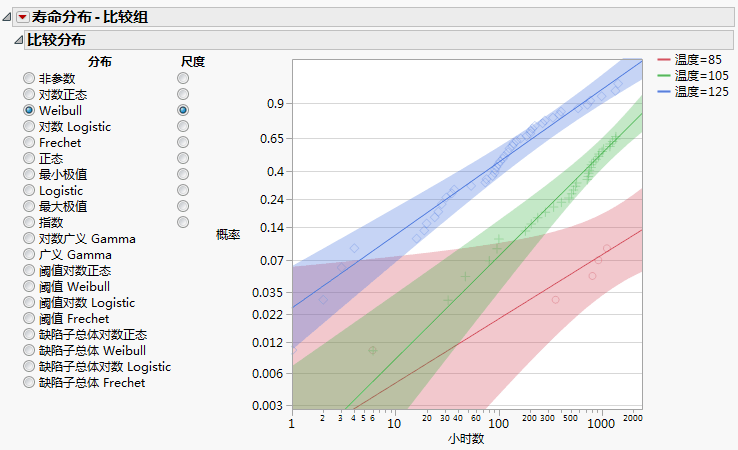基于 Weibull 概率尺度进行绘图时,各点分布在每条线附近。这表明 Weibull 分布为每一个温度组都提供了合理拟合。
