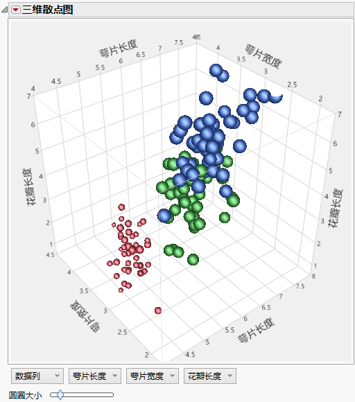 该示例使用 Iris.jmp 样本数据表,其中包含三种鸢尾花的萼片长度、萼片宽度、花瓣长度和花瓣宽度的测量值。