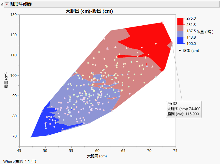 等高线颜色对应于体重,如体重(磅)图例中所示。该图形显示大腿围和腹围是相关的,当其中一个增大时,另一个也增大。着色的等高线指示体重与该关系的符合程度。大腿围和腹围测量值大的人通常也是最重的人。请注意有一个人(第 32 行)不太适合该模式。