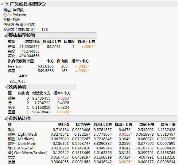 “效应检验”报表还显示分类变量颜色是显著的。颜色具有四个水平:Light Med、Medium、Dark Med 和 Dark。前三个水平的参数估计值显示在“参数估计值”表中。Dark 的参数估计值是前三个水平的参数估计值之和的负数。