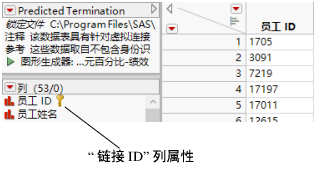 如Education History.jmp 中的“链接 ID”和“链接引用”列属性 中所示,员工 ID 具有“链接 ID”列属性和对 Predicted Termination.jmp 的“链接引用”。