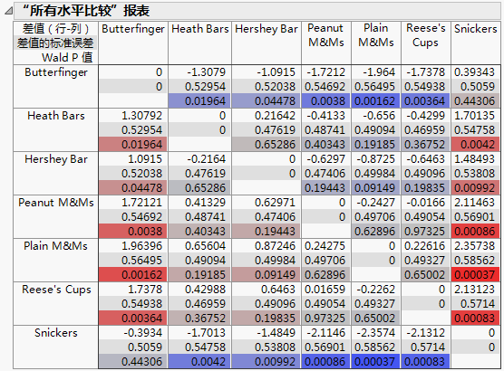 该比较报表指示哪些糖果类型对在效用上有显著差异。每个单元格中的第三个条目是由行项的效用减列项的效用定义的差值的 p 值。p 值颜色的强度指示差值的显著程度。蓝色或红色着色指示差值(行 - 列)是正数还是负数。不调整 p 值来控制多重比较误差率,该值只应作为参考。有关“所有水平比较”报表的详细信息,请参见《消费者研究》中的“MaxDiff”。