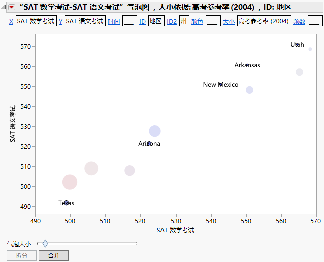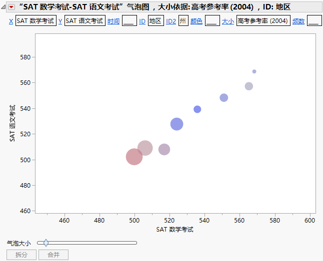 • 较大的气泡表示 2004 年 SAT 考试考生参考率较高的美国各州。这些较大的气泡全部集中在图形左下方。这表示具有较高考生参考率的州的数学和语文分数都较低。