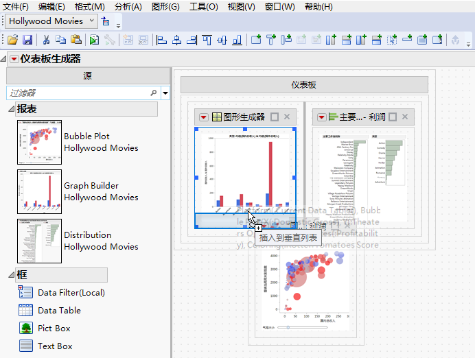 2. 要创建报表,运行名为“分布: 主要工作室 - 利润和类型 - 利润”、“图形生成器: 类型 - 全球和国内总收入”以及“气泡图: 国内总收入 - 首映当周影院数”的表脚本。
